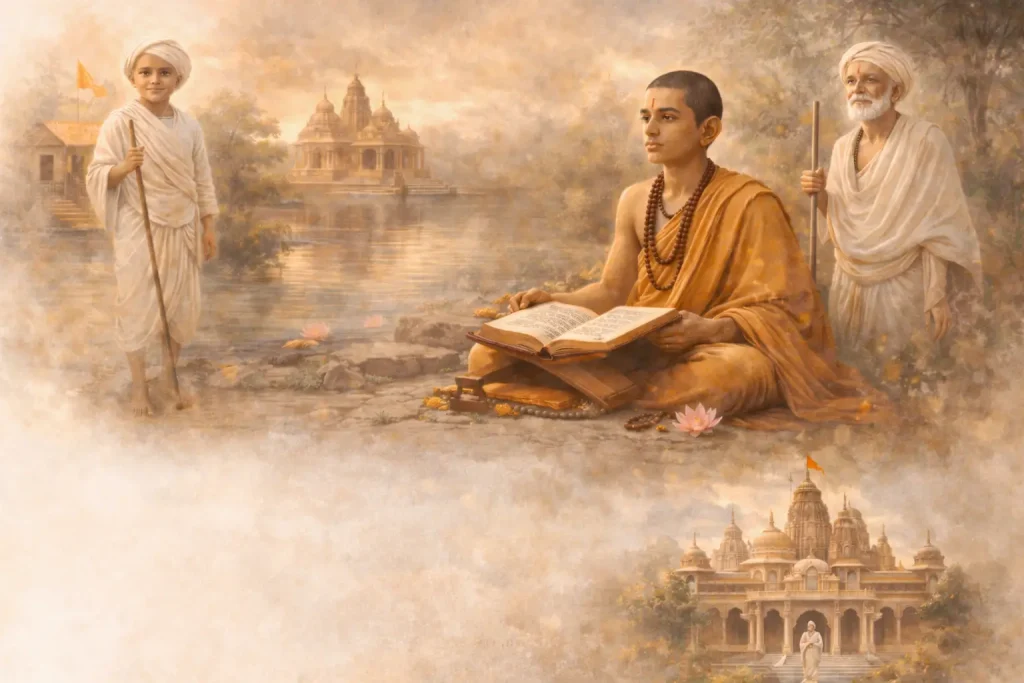 Born into a humble family in the village of Mahelav, Shastriji Maharaj displayed extraordinary spiritual inclination and devotion from early childhood. His deep faith, sharp intellect, and natural detachment from worldly comforts set him apart even as a young boy. Drawn toward a life of renunciation, he left home at a tender age to pursue the path of spiritual realization and service to God.